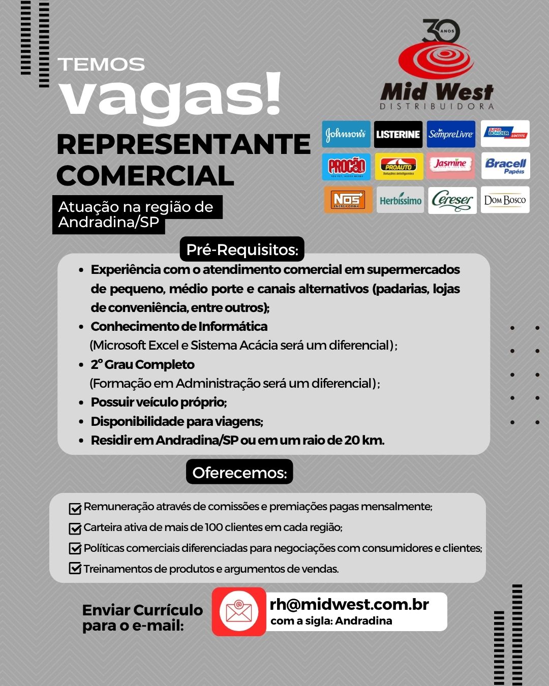 Representante Comercial – AndradinaAndradinaPublicado 2 semanas atrás Site Mid West Distribuidora Currículo: Máx 1Mb em pdf Para se candidatar a esta vaga envie seus detalhes por e-mail para rh@midwest.com.br