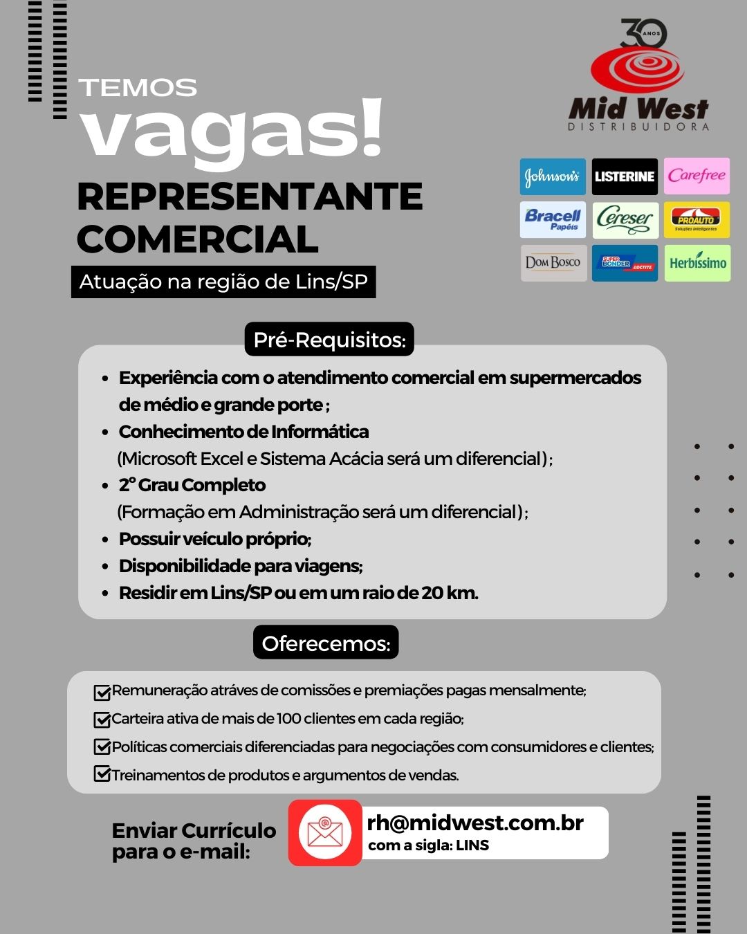 Representante Comercial – LinsLinsPublicado 2 horas atrás Site Mid West Distribuidora Currículo: Máx 1Mb em pdf Para se candidatar a esta vaga envie seus detalhes por e-mail para rh@midwest.com.br